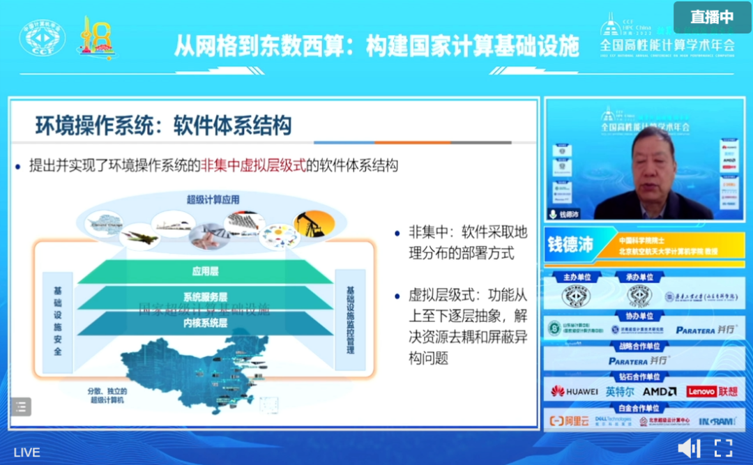 中國(guó)科學(xué)院院士、北京航空航天大學(xué)計(jì)算機(jī)學(xué)院教授、中國(guó)計(jì)算機(jī)學(xué)會(huì)會(huì)士錢德沛在主題演講中,著重介紹了國(guó)家高性能計(jì)算環(huán)境的實(shí)踐,總結(jié)了國(guó)家20多年來在高性能計(jì)算的超常發(fā)展,談到“超算應(yīng)該進(jìn)一步提升其基礎(chǔ)設(shè)施形態(tài)?!?/span>