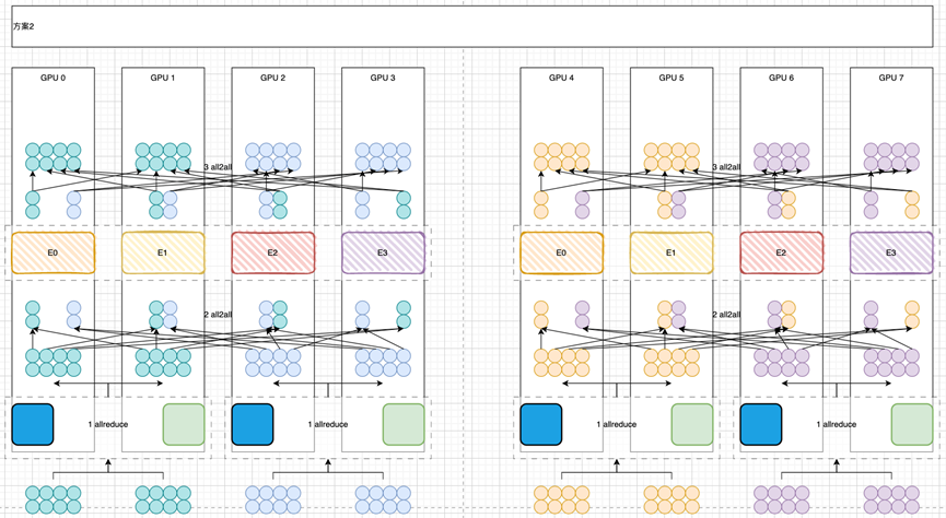 在前向計(jì)算的時(shí)候, Attention部分和之前2個(gè)方案不同,GPU0-GPU1,GPU2-GPU3,GPU4-GPU5,GPU6-GPU7之間需要進(jìn)行Allreduce通信。之后看起來(lái)在MoE部分完成2次All2All操作。細(xì)心的同學(xué)可能已經(jīng)發(fā)現(xiàn),如果按照常規(guī)的All2All操作,第一次會(huì)多發(fā)送1倍的重復(fù)數(shù)據(jù)。第二次進(jìn)行的是一個(gè)類似與上一個(gè)方案的All2All操作。 在反向計(jì)算的時(shí)候,GPU0-GPU4,GPU1-GPU5,GPU2-GPU6,GPU3-GPU7的Expert做Allreduce操作,在Attention部分做GPU0-GPU2-GPU4-GPU6和GPU1-GPU3-GPU5-GPU7的Allreduce操作。