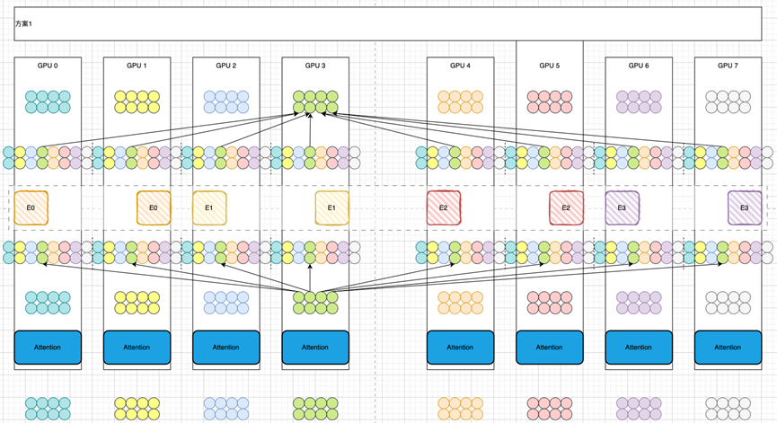 接下來(lái)讓我們稍微進(jìn)階一下。假設(shè)方案0中GPU卡的顯存并不夠。其中一種方案是將Expert維度改變成EP4-TP2,如圖2所示。單機(jī)8卡,4個(gè)專家,Attention部分(藍(lán)色)采用DP8,MoE部分采用EP4-TP2。