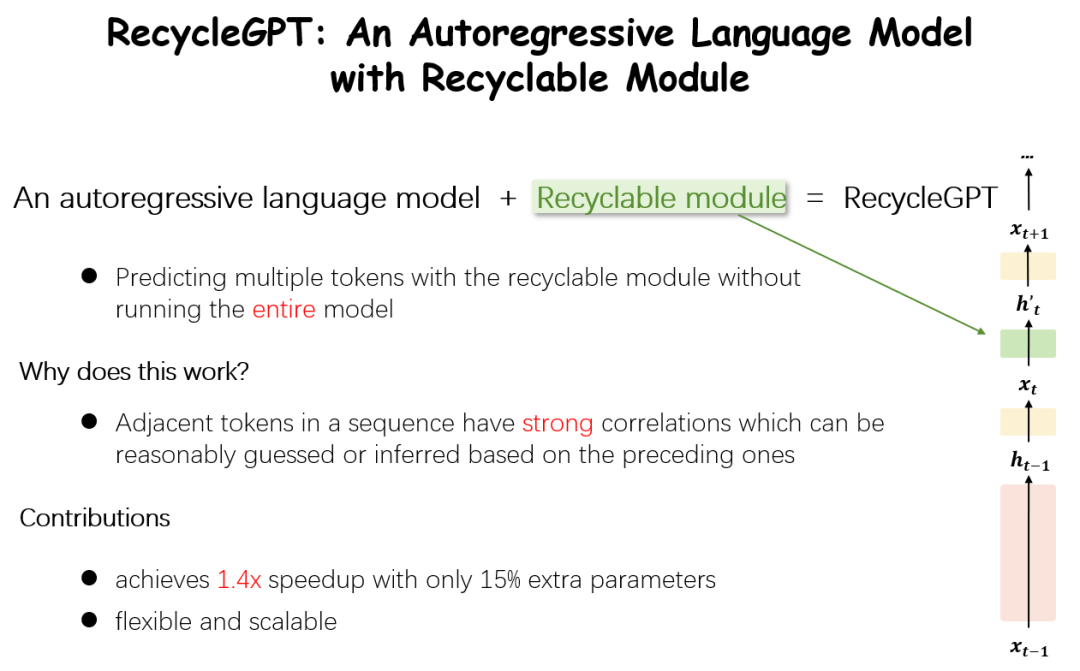 為了解決Low parallelizability,我們?cè)?月份提出了RecycleGPT[6],一種可重復(fù)利用模型狀態(tài)加速解碼過(guò)程的模型,在近乎無(wú)效果損失的前提下,實(shí)現(xiàn)了1.4倍的推理加速,并引起了廣泛關(guān)注。